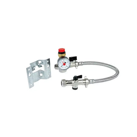 - Complete kit: Includes filling loop, safety relief valve with gauge, mounting bracket, and manifold fitting.
