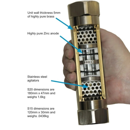 The internal self-cleaning agitators (a patented Aquabion design feature) create turbulence upstream and downstream of the zinc anodes. This turbulence maximises contact between the zinc ions and the calcium in the water, and simultaneously keeps the anode surfaces clean — which is why Aquabion requires no maintenance or periodic servicing. As the zinc anodes are gradually consumed by the galvanic reaction, they are naturally replenished from the anode mass inside the unit, maintaining consistent performance throughout the 7-year service life.