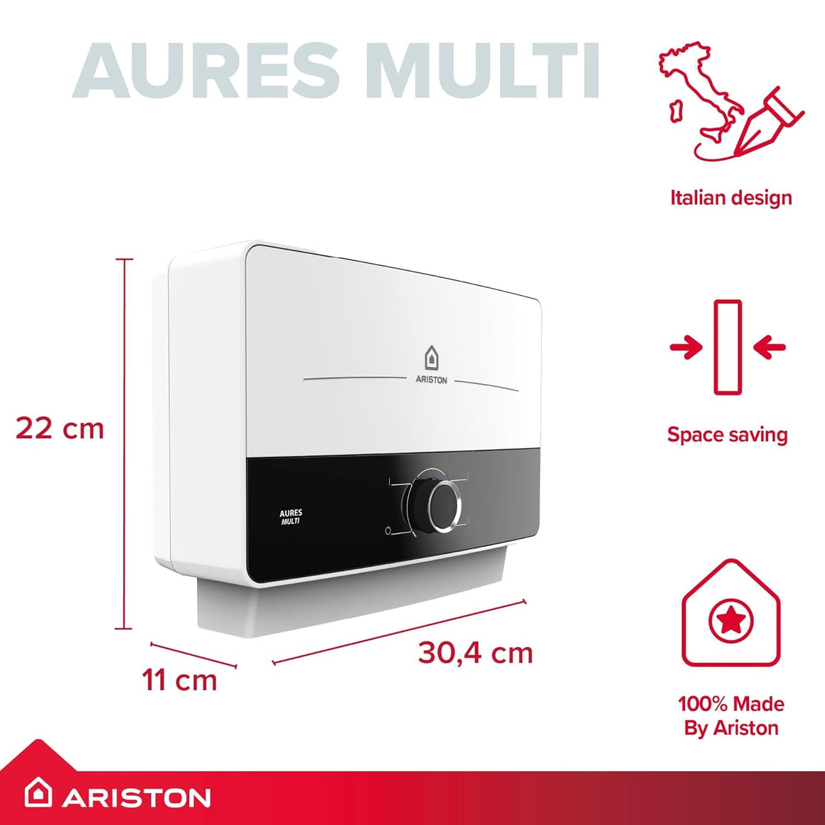 The Ariston Aures Multi 9.5kW is a compact, wall-mounted instantaneous electric water heater that delivers hot water on demand without the need for a storage cylinder or pre-heating time. Designed specifically for the UK market, the Aures Multi heats water as it flows through the unit β providing hot water only when a tap is opened, and stopping as soon as the tap is closed. This eliminates standby heat losses entirely, earning the unit an ErP energy efficiency class A rating.