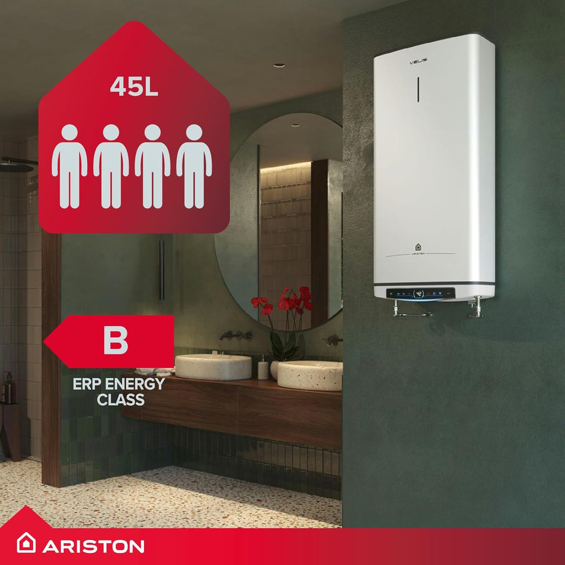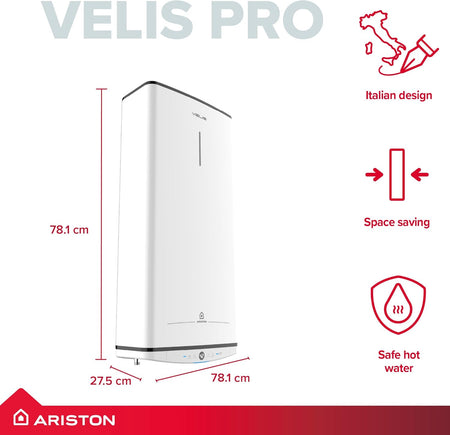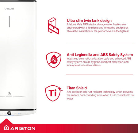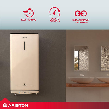 The Ariston Velis Pro 45L is an ultra-slim electric storage water heater with a premium flat design and twin-tank technology, ideal for compact spaces, leisure applications, and small households needing fast, efficient hot water.