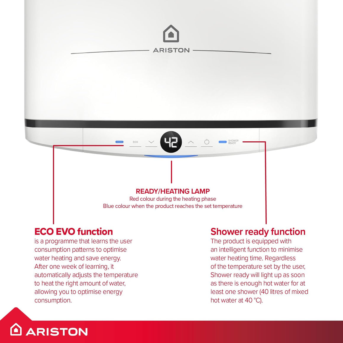 | Functions | Eco Evo, anti-legionella, ABS safety system, shower-ready alert |