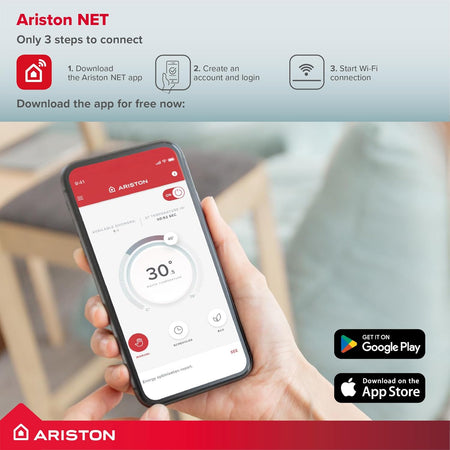 - Wi-Fi enabled for remote monitoring and control via Ariston Net app, enhancing convenience and energy management.
