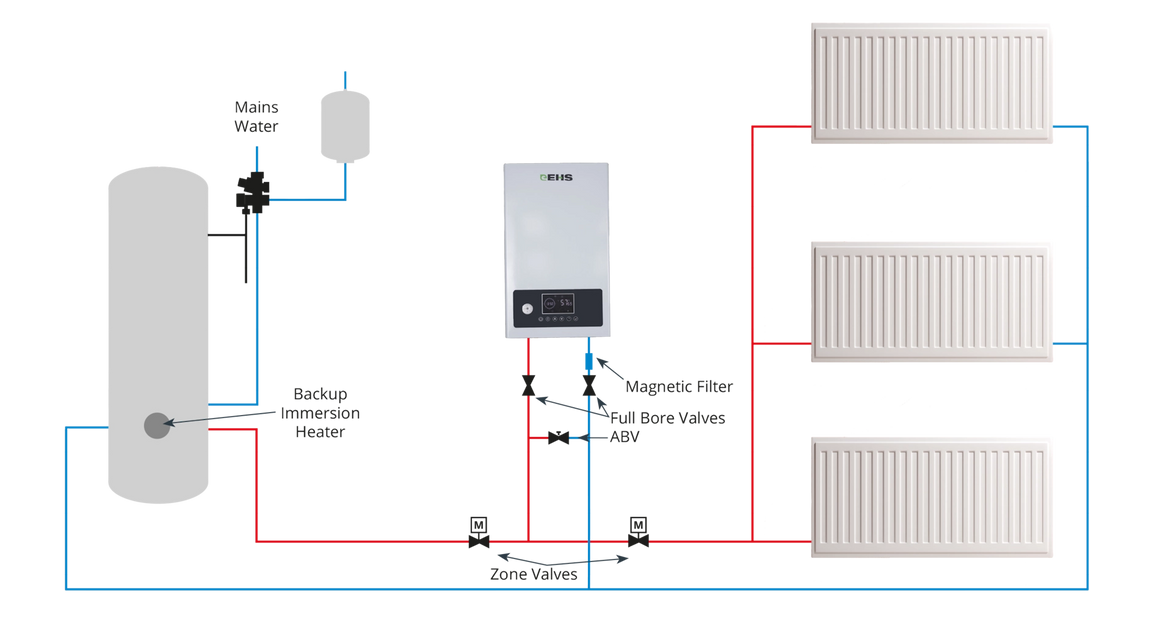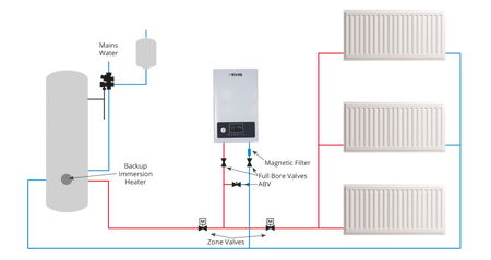 - Boiler type: Electric system boiler for space heating, used with a separate indirect cylinder for DHW.