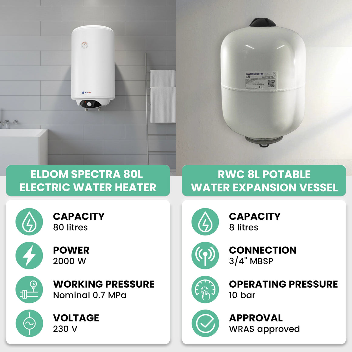 Eldom Spectra 80 Litre Vertical Unvented Electric Water Heater 2 kW Bundle