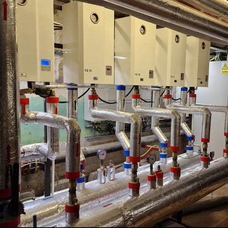 - Hybrid systems where an electric boiler backs up a heat pump in cold weather.