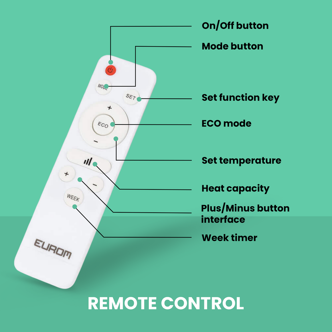 | Controls | Eurom Smart App (WiFi), handheld remote control, built-in thermostat, control panel |
