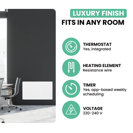 - Integrated Thermostat & Timer: Maintain your ideal comfort level with precise temperature control and automated heating cycles using the integrated thermostat and app-based week timer.