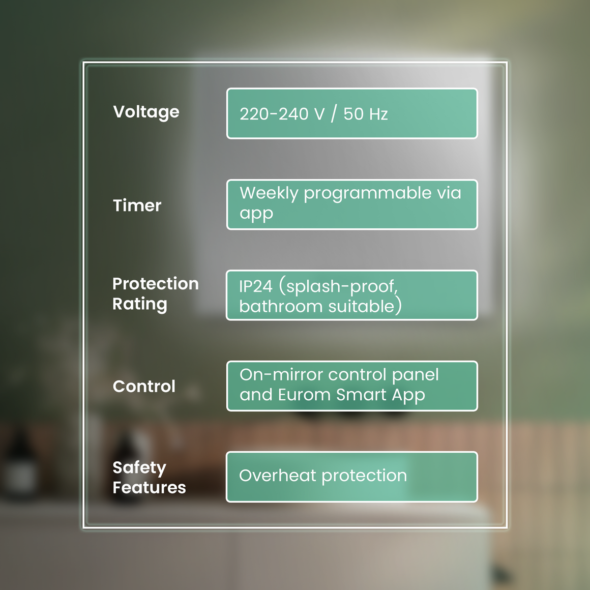 | Control | On-mirror control panel and Eurom Smart App (WiFi) |