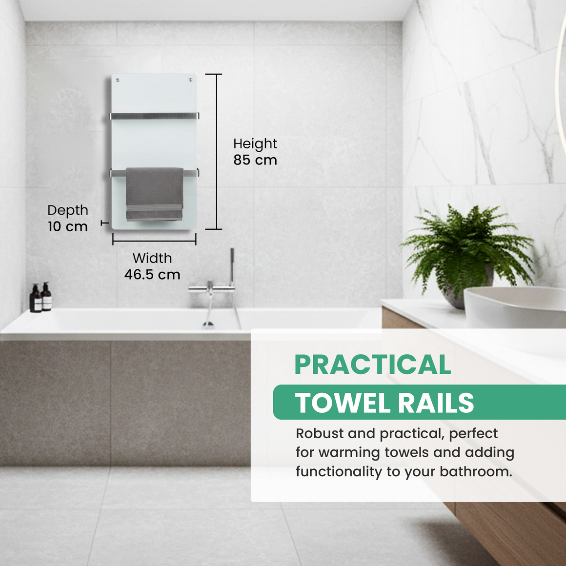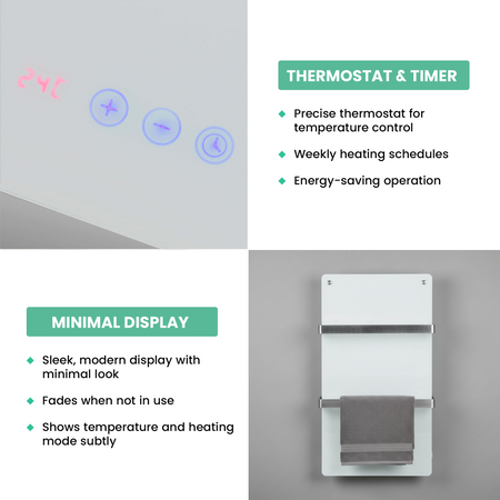 The practical towel rails warm towels efficiently, enhancing comfort, while app control allows you to tailor heating schedules and save energy effortlessly.