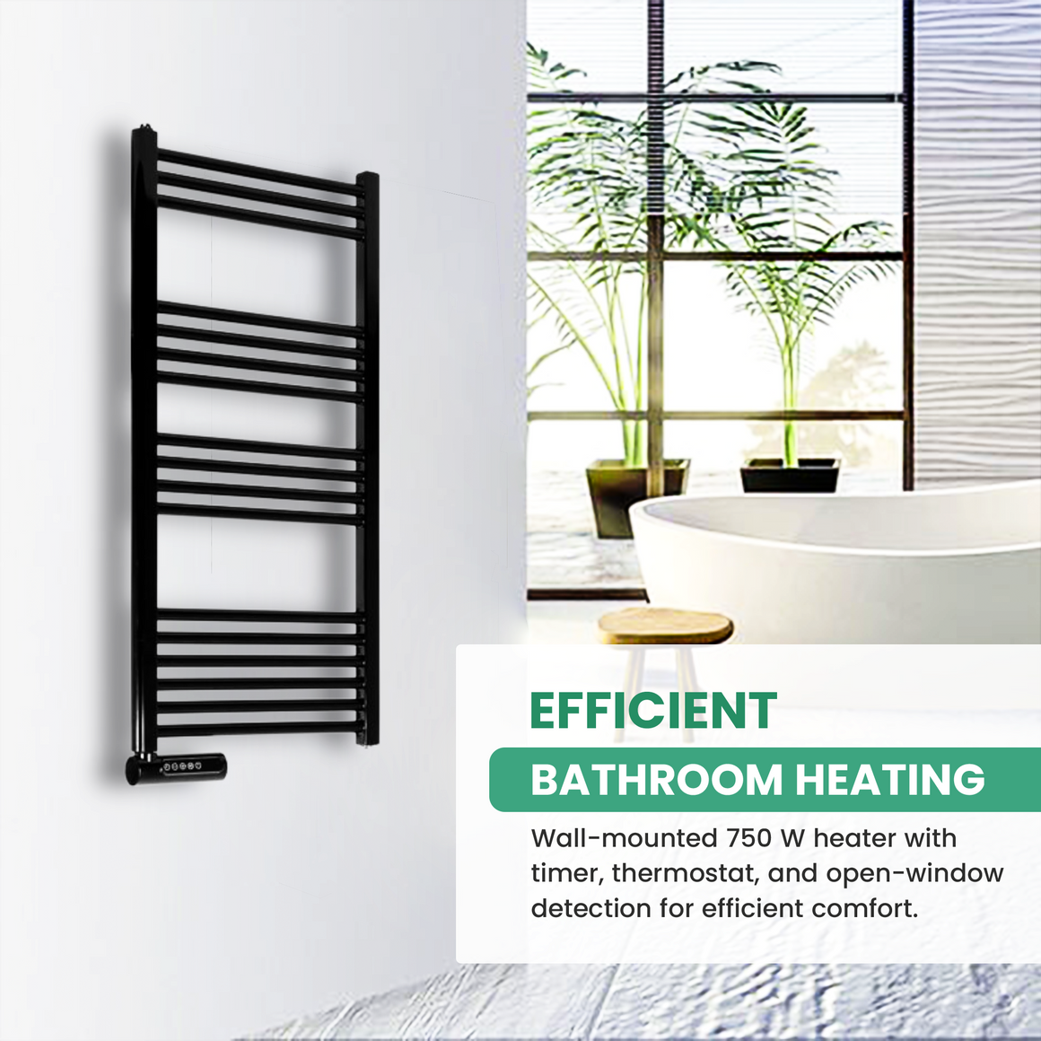 This model incorporates user-friendly features such as an adjustable timer (0 to 9 hours) allowing you to customize heating periods, ensuring warm towels and a cozy bathroom environment exactly when you want. The built-in thermostat maintains consistent temperature, while the open-window detection function reduces heating when cold drafts are detected, saving energy efficiently.