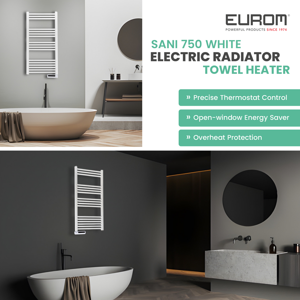 Eurom Sani-Towel 750 White Electric Bathroom Radiator – Powerful and Efficient Towel Warmer with Timer and Safety Features