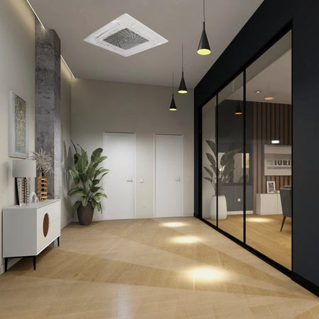 - Discreet ceiling installation – 4‑way cassette delivers comfortable airflow without occupying wall space, ideal for clean interior design.