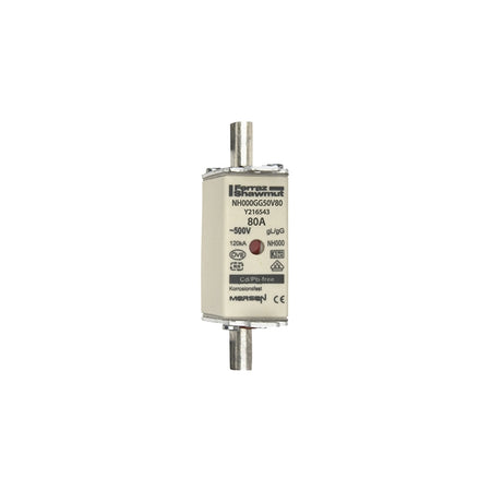 The Mersen 80A Fuse - NH gG 500V size 000 is a standard NH fuse-link designed for general purpose cable and line protection in low-voltage electrical systems, featuring gG characteristics, 500VAC rating, and double indicator for status monitoring.