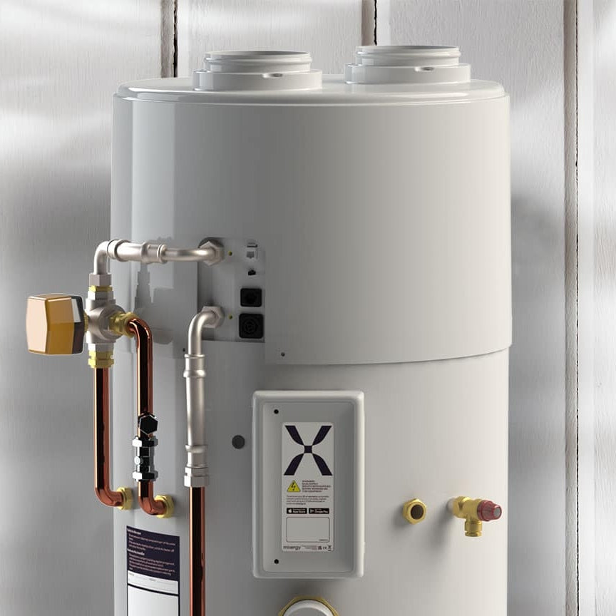 - Suitable for retrofit or new build, fitting much like a standard unvented cylinder but requiring external wall ducting for air intake and exhaust.