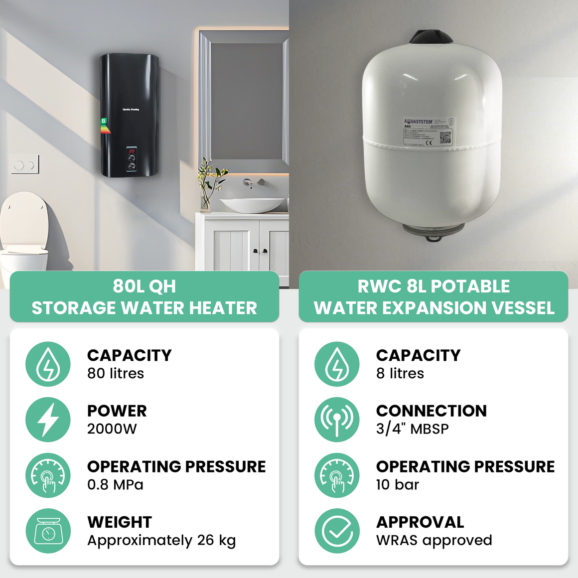 80 QH Litre Electric Storage Water Heater Bundle with Expansion Vessel and Fitting Kit