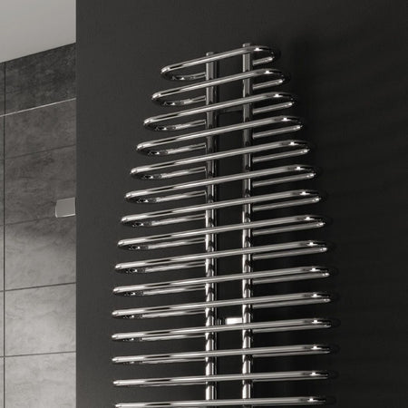 The Reina Teano RND-TEN6130 Chrome Towel Radiator features a striking modern design crafted from mild steel with a polished chrome finish. This radiator, with dimensions of 600mm width by 1300mm height, offers excellent heat output and serves as a stylish focal point for any bathroom or kitchen. It is compatible with central heating, electric, and dual fuel systems, providing versatile heating solutions.
