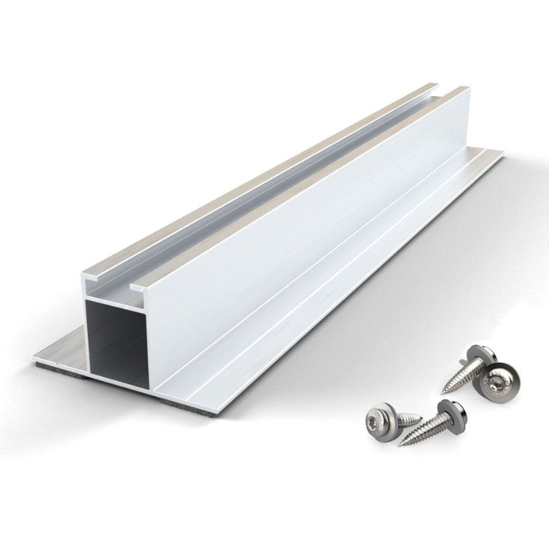 The Renusol MetaSole+ PORTRAIT Rail (Part No: REN-420421) is a compact and efficient mounting rail designed for vertical (portrait) installation of PV modules on trapezoidal sheet metal roofs. It is optimized for use without continuous rails and supports a maximum distance of 370mm between the centres of raised trapezoidal ridges. Suitable for PV modules with frame heights between 30mm and 50mm, the system allows installation directly onto metal roofing using included self-tapping screws, eliminating the need for pilot drilling. This product is compatible with trapezoidal sheet steel and aluminium roofs and comes with a pre-assembled EPDM strip to ensure waterproof installation.
