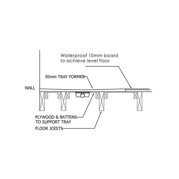 Not recommended without over-boarding first. Existing floorboards can flex under foot load, which will stress the tile adhesive and grout over time and may crack tiles. It is strongly recommended to over-board the existing floor with 10mm Taurus tile backer board (rigid XPS or cement board) before laying the tray former. This provides a firm, moisture-resistant substrate and prevents flex. On solid concrete or screeded floors, the tray former can be bedded directly.