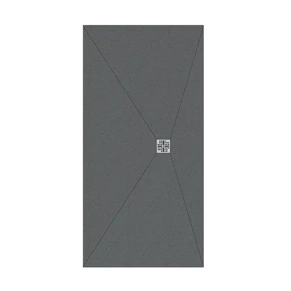 The square waste is positioned at the centre of one short end of the tray. The tray surface falls in a single direction along the full tray length towards the drain at the end. A simple, single-direction fall.