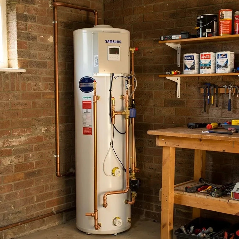 - System type: indirect unvented mains‑pressure hot‑water cylinder for use with Samsung ASHP as primary heat source, with integrated buffer for space‑heating hydraulic stability.