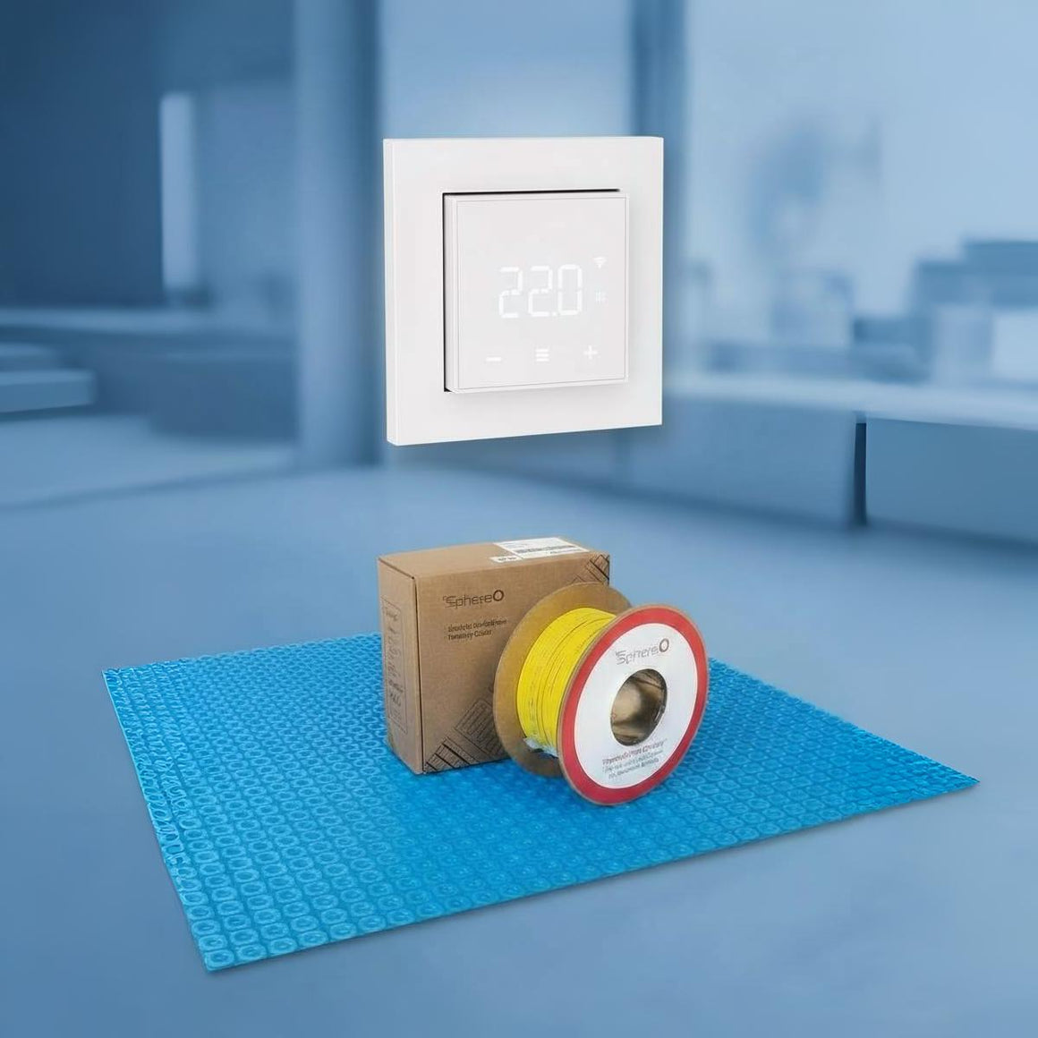 Elevate your home heating with our ThermoSphere Premium Electric Underfloor Heating Bundle, featuring the advanced Thermosphere Ultimate Loose Lay Underfloor Electric Heating Cable and the intelligent Thermosphere T-MO Thermostat in White. This high-end kit delivers customizable, efficient warmth for any room type— from bathrooms and kitchens to living rooms, bedrooms, or conservatories. The spliceless cable design ensures reliability and safety, while its flexible spacing allows you to tailor heat output to your space. With peel-and-stick backing for effortless loose lay installation, you can secure the cable quickly without specialist tools, making it perfect for DIY or professional setups under tiles, laminate, vinyl, or carpet. Paired with the T-MO Thermostat's Wi-Fi and Bluetooth connectivity, control your heating remotely via app for ultimate convenience and energy savings. Enjoy silent, even heat distribution, no bulky radiators, and a luxurious feel underfoot, all backed by premium warranties for peace of mind.