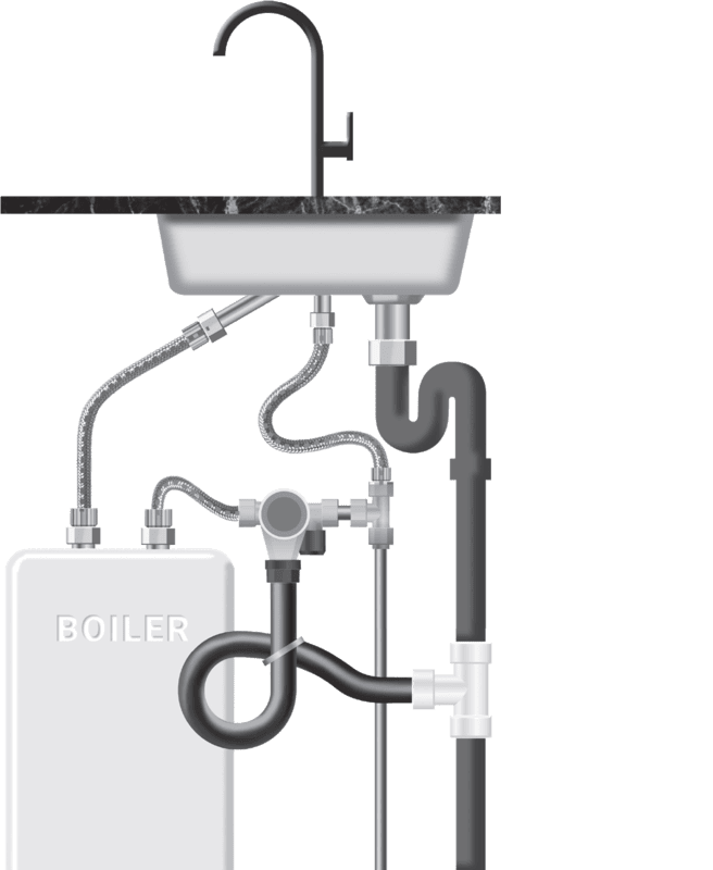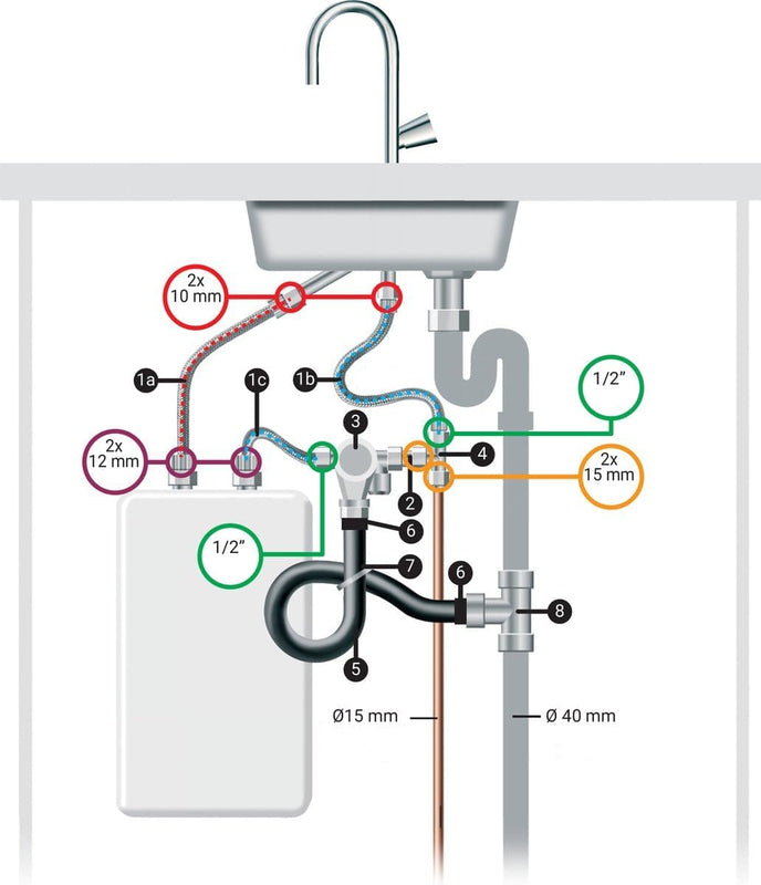 This connection kit is suitable for water heaters with 1/2” external thread connections and is ideal for setups involving a 15 mm cold water pipe and a nearby sink waste pipe (Ø40 mm PVC).