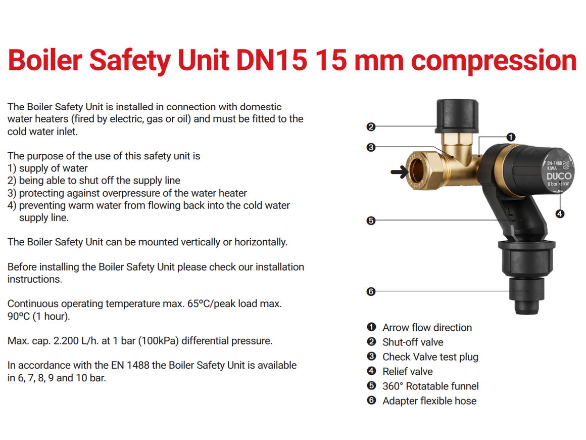 - Pressure Relief Release Valve, with a 360 degrees rotable tundish (funnel), Inlet combination DN15, 15 mm compression fitting, pressure rating: 6 bar, 1/2” male thread (Potable Water 1/2″ MBSP x 15mm)